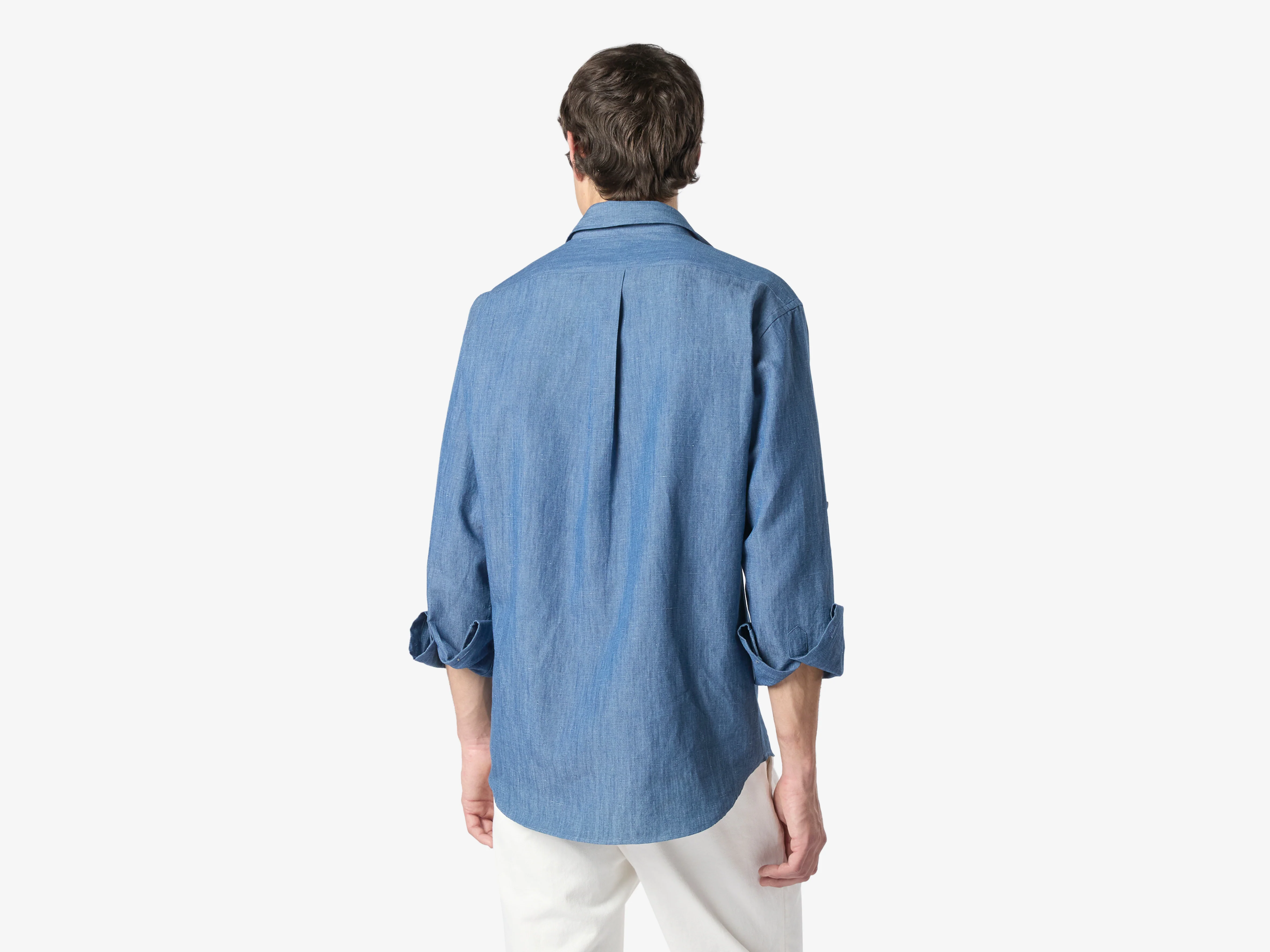 La SAHARAN SHIRT è una camicia con colletto classico e tasche sul petto, realizzata in tessuto denim di cotone e lino. Ispirata alle camicie da safari, questa camicia offre grande comfort grazie alle ampie tasche sul petto e alle maniche arrotolabili.
